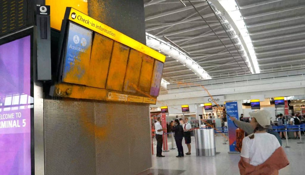 A total number of 140 people have taken action, with 84 arrested so far, and hundreds joining demonstrations. 10 are being held in prison on remand, with an additional 23 currently held in police custody. This week has seen repeated actions at UK airports – with seven arrested for blocking the security gates of Gatwick Airport (LGW) on Monday, followed by another action on Tuesday at Heathrow Airport that saw the departure boards painted orange. [4] [5]